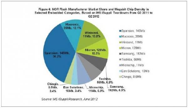 根據IHS iSuppli公司在三個季度內拆解分析的55個嵌入產品,這些產品中有三分之一以上的NOR芯片屬于美國Spansion Inc.,在所有供應商中處于領先地位,如圖所示。Spansion,以及韓國三星電子和美國美光,提供的NOR芯片平均密度為數百Mb。從2011年第三季度到今年第二季度,這三家公司占上述三個子領域中NOR芯片的53.4%。剩下的46.6%市場份額屬于生產100Mb以下密度NOR閃存的廠商。這類廠商包括臺灣旺宏電子和華邦電子等大型廠商,以及臺灣常憶科技和宜揚科技等規模較小的廠商。