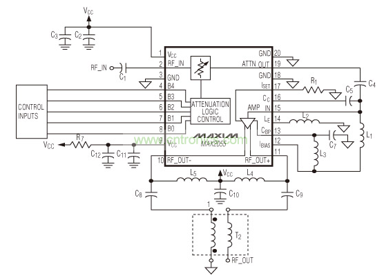 Maxim的MAX2055、MAX2027可用作MAX12559的緩沖放大器,MAX2055是一個帶寬在30~300MHz的數(shù)控可變增益放大器(圖2)。