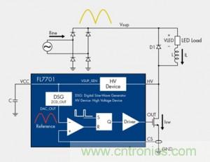 FL7701集成有功率因數校正(PFC)??梢詮氖褂眯⌒吞沾删S持電容的整流離線輸入來供電。這樣就可省去輸入端的電解電容,也不需要用于IC的自偏置電源軌。