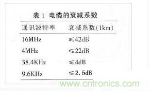 導線的電阻對信號的影響很小,可以忽略不計。電纜的分布電容C主要是由雙絞線的兩條平行導線產生。信號的損失主要是由于電纜的分布電容和分布電感組成的LC低通濾波器。通訊波特率越高,信號衰減也會越大。常規電纜的衰減系數見表1。