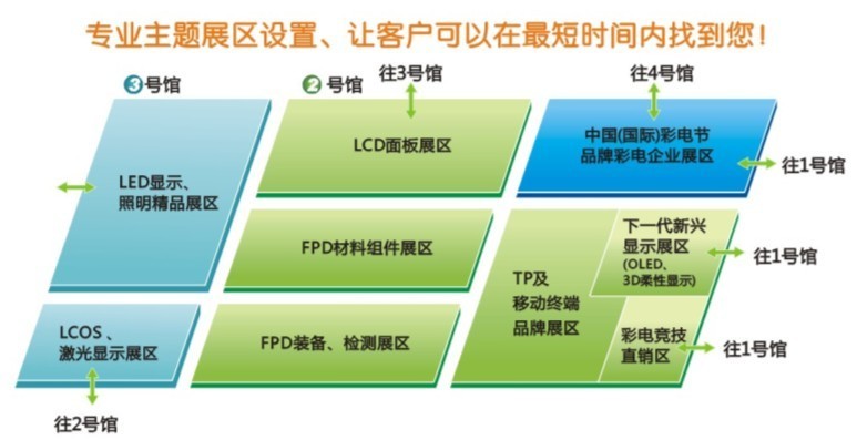 作為光電顯示行業的標志性活動,深圳光電顯示周暨中國(國際)彩電節將一如既往地覆蓋光電顯示全產業鏈,設立LCD面板展區、FPD材料組件展區、FPD裝備及檢測展區、彩電節品牌展區、彩電競技直銷展區、TP及移動終端品牌展區、下一代顯示展區等7大專區,主要展示液晶顯示、OLED、觸控、TV3D等上中下游產業鏈最新技術與最新產品等。