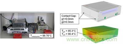 底盤的一部分被用作汽車功放的冷卻散熱片。底盤的一個重要方面在于頂部支架和底蓋的熱接觸程度(關乎制造公差)。對模型假設進行驗證是提高模型精確度的關鍵。這樣可以測量產品原型并利用測量結果來比較模擬模型。方案1 (g1) 無間隙(完全熱接觸),而方案2(g2) 則存在0.3毫米的間隙,因此蓋子之間沒有熱接觸。通過比較所測量的外殼溫度,方案2(有間隙)似乎最能代表支架的接觸程度。