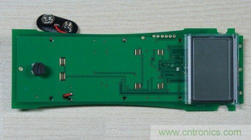翻轉(zhuǎn)板卡,另一面的電路就更少了,除了一個段式的LCD模塊,以及幾個功能按鍵(黑色旋鈕為校準溫度的變阻器),就沒什么東西了,有意思的是段式LCD模塊與PCB板的連接方式。