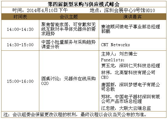 此次峰會旨在幫助供需雙方的經理人了解熱點市場帶來的對半導體元器件的需求變化,中國小批量供應服務與采購趨勢。圓桌討論將針對采購和供應中的熱點話題,中國電子分銷商聯盟秘書長劉杰博士與行業領先的國內和國際分銷商總裁和總監們逐一分享思路,歡迎參與互動。參會可以通過網上或微信(關注我愛方案網),報名注冊:m.sn-icity.com/seminar/95/agenda
