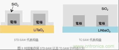 圖3是村田制作所STD-SAW以及TC-SAW構造的示意圖。SAW雙工器的頻率溫度依賴性是由于使用了壓電電路板造成的。此外,STD-SAW、TC-SAW都是因為使用的壓電電路板具有頻率溫度依賴性的相同特點。如圖3所示,TC-SAW最具代表性的特征之一是整塊電路板跟STD-SAW相比它的表面覆蓋了一層很厚的二氧化硅(SiO2)。壓電電路板的溫度上升的話頻率就會降低,那么頻率溫度系數就會變成負值。另外,SiO2具備正頻率溫度系數的特點。因此,和STD-SAW相比的話由于覆蓋了一層厚SiO2的獨特構造,SiO2的正頻率溫度系數的影響會變大,那么SAW雙工器與STD-SAW相比就實現了抑制頻率溫度依賴性的特點。STD-SAW的保護膜SiO2具有強大的特質,如果覆蓋了像TC-SAW一樣厚的SiO2的話就不能保證帶寬,同時也不能獲得優良的特性。因此,TC-SAW將電路板的材料從LiTaO3變成了LiNbaO3,才能夠確保必要的帶寬。此外,TC-SAW的LiNbaO3的切割角發生了變化使得頻率選擇性變得可控制,村田制作所運用了對應項目的必要特性設計了符合市場需求的最佳切割角。