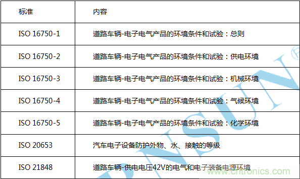 ISO 16750 系列標準是國際標準化組織ISO 最近幾年推出的針對汽車電子的環(huán)境可靠性標準,該標準是歐系車常用的標準,并且逐漸被世界各國轉化為國家標準,也逐漸被各企業(yè)標準所引用,成為應用比較廣泛的汽車電子的環(huán)境可靠性標準。該系列標準包括五個部分: