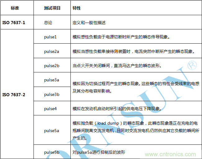 針對汽車電子自身產(chǎn)生的干擾,國際無線電干擾委員會(CISPR)對汽車電子業(yè)提出了嚴格的要求,尤其是車載收音機、數(shù)字電視、導航設備都是這種干擾的重災區(qū)。所以 CISPR25:用于保護車載接收機的無線電騷擾特性的限值和測試方法,對汽車電子自身的發(fā)射狀態(tài)也有了明確的等級判定。EMS方面的測試項目如下所示: