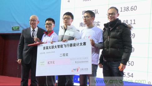本次大賽評審委員會由大聯大、白金級贊助商恩智浦(NXP)和行業內專家共同組成,經過對所有參賽飛行器軟硬件架構、外觀設計、現場飛行平穩度和精準度等方面的綜合考量,來自南京航空航天大學南航二隊參賽隊的四軸飛行器凌空號作品表現優異,以306.69的總分最終獲得了本屆大賽的總冠軍。北京科技大學的金戈參賽隊和鄭州航空工業管理學院的Blue Dream High參賽隊分別獲得了亞軍和季軍。