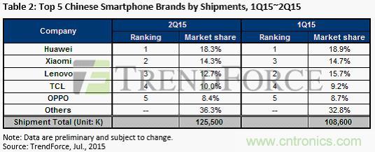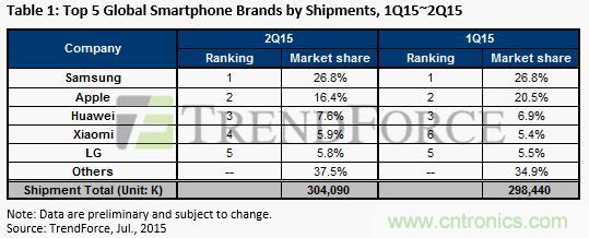 【導讀】近日,市場研究機構TrendForce發(fā)布2015年度第二季度全球智能手機報告。中國的華為明顯獨領風騷。數據顯示,三星雖然從蘋果手里奪回第一的寶座,但是,Q1和Q2 幾乎毫無變化。蘋果的市場份額則一調再掉,從Q1的20.5%掉到Q2的15.4%。華為的市場份額增加了7%,小米的份額增加了5%。