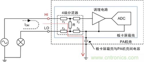 3.電流通道接入高端和低端,測量結(jié)果也不同,內(nèi)部板卡屏蔽殼與機殼間多少都會存在一些雜散電容(空間中兩個絕緣導體中存在電容),若電流通道接入高端,產(chǎn)生泄漏電流(圖3中紅色標記線),因此電流測量輸入應(yīng)當串在共模電壓較低的地方(低端)。