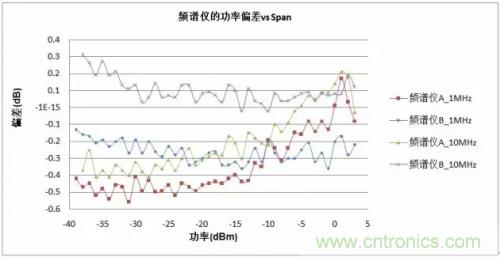 從上述測(cè)試結(jié)果我們發(fā)現(xiàn)Span的變化對(duì)頻譜分析儀A的幅度誤差影響較小,但測(cè)試功率變化時(shí)則產(chǎn)生了較大的誤差。而頻譜分析儀B針對(duì)不同的測(cè)試功率有著較好的精度,Span的變化卻導(dǎo)致了約0.4dB的誤差。