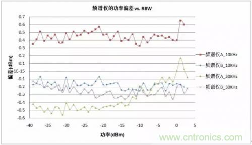 頻譜分析儀B在RBW=10kHz和30kHz條件下,的幅度測(cè)試誤差約為-0.1dB至-0.35dB之間。