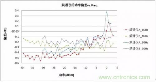 從測(cè)試結(jié)果我們發(fā)現(xiàn),在1GHz和2GHz這二種頻率條件下所測(cè)得的二臺(tái)頻譜分析儀的幅度誤差,顯然就是頻譜儀資料中所提到的頻率響應(yīng)指標(biāo)。
