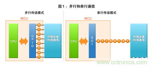 單片機(jī)是嵌入式設(shè)備的“頭腦”,其與作為嵌入式設(shè)備的“手和腳”是各種外圍設(shè)備(輸入輸出設(shè)備等)連接。單片機(jī)應(yīng)該怎樣與這些外圍設(shè)備連接才好呢?比如,我們來考慮一下將傳感器與單片機(jī)連接的情況。如果使用本連載第1期中介紹的“GPIO”的話,從傳感器向單片機(jī)傳送8位信號(hào)時(shí)需要使用8個(gè)引腳。這種傳送模式被稱為并行(并行通信)模式(圖1―左)。但是,僅一個(gè)傳感器就需要連接8個(gè)引腳,確實(shí)太可惜了,是否還有連接更少的引腳就能達(dá)到同樣目的的方法呢?