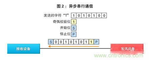 在異步通信模式的串行通信狀態(tài)下,一字節(jié)的文字信息※1在“開始位”(Start bit,意味著開始發(fā)送)和“停止位”(Stop bit,意味著停止發(fā)送)之間發(fā)送(圖2)。由此,無需I2C (Inter-Integrated Circuit,內(nèi)部集成電路)”及“SPI(Serial Peripheral Interface,串行外設(shè)接口)”等時(shí)鐘信號(hào)線(但在其他的串行通信模式中這些時(shí)鐘信號(hào)線是必需的,以對(duì)發(fā)送和接收的時(shí)序進(jìn)行同步)。另外,還可追加用于檢查數(shù)據(jù)是否已正常發(fā)送的“奇偶校驗(yàn)位(Parity bit)※2”。