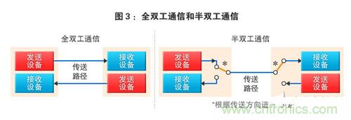 在異步通信中,能實(shí)現(xiàn)按“單片機(jī)→外圍設(shè)備”或“外圍設(shè)備→單片機(jī)”的方向確保數(shù)據(jù)信號(hào)專用的信號(hào)線時(shí),被稱為全雙工通信。另一方面,將通過1根信號(hào)線來切換通信方向的方式稱為半雙工通信。全雙工方式時(shí)需要2根信號(hào)線,可同時(shí)進(jìn)行發(fā)送和接收。半雙工方式時(shí)僅需1根信號(hào)線,但必須在發(fā)送和接收之間進(jìn)行切換(圖3)。