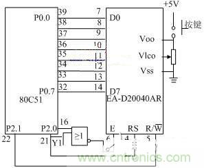 LCM點陣式液晶顯示模塊能顯示的字符多,并且能顯示漢字,因而在智能化測量控制儀表中得到了廣泛的應用。本系統選用的是EPSON公司生產的EA-D20040AR點陣式液晶顯示模塊,它由TN型液晶顯示器、CMOS驅動器和CMOS控制器組成,模塊內集成有字符發生器和數據存貯器,采用單±5V電源供電,內部有能顯示96個ASCII字符和92個特殊字符的字庫。EA-D20040AR與單片機80C51的接口電路如圖4所示: