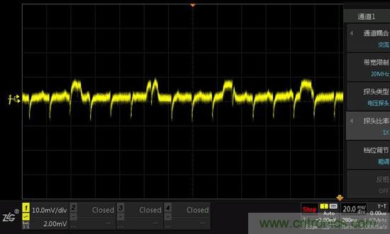 從圖中可以看出,所測的波形夾雜著許多的噪聲和雜波,直流、交流波形混在一起,沒辦法清晰的觀察紋波,導致無法準確的測量紋波的值。很多工程師測量紋波出現這種情況是因為沒有掌握正確的紋波測量方法。