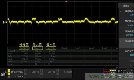 紋波測試一般以峰峰值來表示,具體可以使用【measure】進行自動測量,如下截圖ZDS2000系列示波器,能支持51種真正意義的參數測量統計功能,基于全存儲深度的基礎上測量紋波的參數,或者也可以使用“一鍵光標”進行手動測量,如下圖6所示。