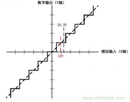 出現(xiàn)這種情況的原因首先是由測量設(shè)備內(nèi)部的ADC產(chǎn)生的量化誤差引起的,假設(shè)測量設(shè)備內(nèi)部包含一個11位的ADC,ADC共有211=2048個有效位,在1000V的量程(峰峰值)下,考慮最大±1000V的輸入共2048個有效位,則由于不可避免的噪聲的影響,ADC每跳動一個最小單位1LSB,產(chǎn)生的量化誤差大約會有2000V/2048≈1V。如果使用該量程測量10.3V這樣的信號,很顯然單次ADC取樣的最小分辨率已無法識別0.3V這樣刻度(在圖 2的量化示意圖中0.3V處在兩個刻度中間),當然無法測得正確的值。如果無規(guī)則噪聲的峰值能大于1LSB時,多次采樣取平均值后可以提高測量系統(tǒng)的有效位數(shù),但這樣的因素不在我們考慮的范圍之內(nèi)。