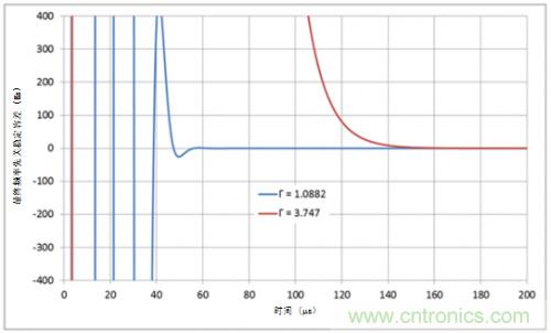 但較高的伽馬值也有其蔽處:鎖定時間更長。圖4所示為不同伽馬值下200MHz頻率躍變的鎖定時間;回路帶寬和相位邊限保持不變。當伽馬值和回路帶寬分別為1和3.7,穩(wěn)定容差在±100Hz范圍內,模擬鎖定時間值分別為46.5µs與118µs。