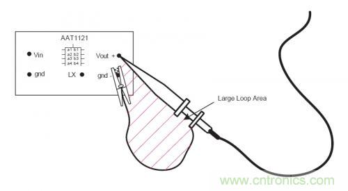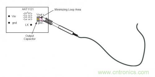 在測量中,如何減小拾取的輻射噪聲?最簡單可靠的方法是采用一個(gè)接地環(huán)來測量電源紋波以及噪聲。為了進(jìn)一步的降低測試誤差,可以將示波器探頭和地線直接放在電源輸出電容得兩端。如下圖所示,采用這種方法,在信號探頭和地線之間的環(huán)路面積很小,所以測量中帶來誤差的噪聲幾乎可以忽略。