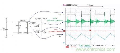 下圖描述了采用兩個(gè)不同的測試方法得到的Vout波形。電源電路是一個(gè)BUCK轉(zhuǎn)換電路(AAT1121),工作在1.5MHz的開關(guān)頻率,輸出電壓為1.8V/250mA。示波器采用全帶寬測試。可以看到伴隨著PWM開關(guān),在綠色的trace2有一個(gè)很高的噪音以及振鈴,但是trace3上卻沒有明顯的噪聲。通過對比可以看到,測試方法的選擇對結(jié)果的準(zhǔn)確性很關(guān)鍵。