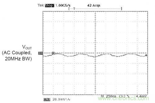 下圖是采用20MHz帶寬限制測試到的電源的紋波以及噪聲。示波器20MHz的帶寬限制是為了防止無源探頭帶入的共模噪聲。可以看到AAT1121BUCK轉(zhuǎn)換器的紋波噪聲為10mVp-p,幾乎看不到開關(guān)噪聲。這主要是歸功于BUCK控制器的低噪聲設(shè)計(jì),良好的PCB設(shè)計(jì),以及恰當(dāng)?shù)臏y試方法。