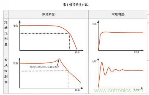 諧振點在頻域及時域的影響如表1中所列圖示。其中短地線(彈簧地)測量用圖3所示模型分析;長地線(鱷魚線)測量用圖4所示模型分析。
