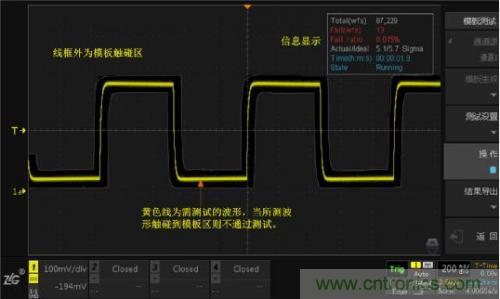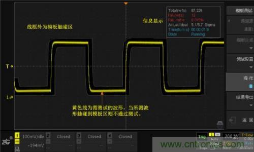 上圖就是模板測試的測試界面,其中,線框外為模板觸碰區,波形接觸到該區域會被判定為不合格波形,即“Fail”。沒有接觸到模板觸碰區的波形為“Pass”。右上角顯示信息是模板測試中的一些狀態信息。