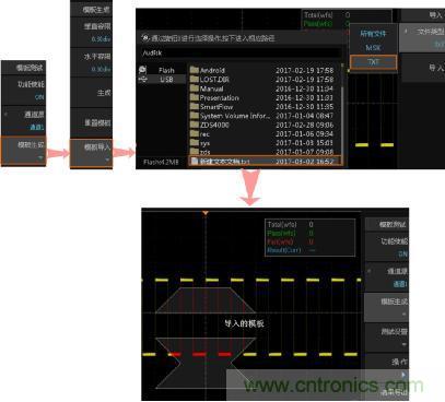 當原始波形沒辦法滿足我們對波形的限制時,用戶還可將儀器內部Flash存儲器或外部U盤中存儲的測試模板文件導入,導入的波形可以是以前保存的*.msk文件或者是自行設置的*.txt文件。