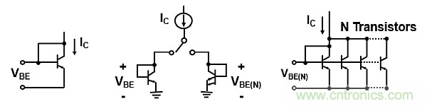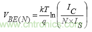 公式(2)顯示了許多并聯晶體管的基極-發射極的VBE(N)值。
