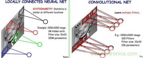 CNN中認為同一層中的權重參數可以共享,因為同一張圖片的各個不同區域具有一定的相似性。這樣原本的全連接計算量過大問題就解決了,如下圖所示: