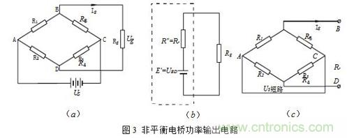 (3)Rg相對(duì)橋臂電阻可比擬時(shí)的非平衡電橋(功率輸出形式)當(dāng)負(fù)載電阻Rg與橋臂電阻可比擬時(shí),則電橋不僅有輸出電壓Ug,也有輸出電流Ig,也就是說有輸出功率,此種電橋也稱為功率橋。功率橋可以表示為圖3(a)。
