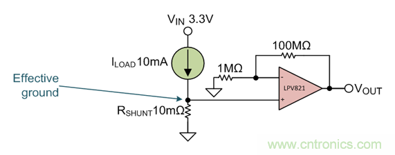 電源電壓為3.3V。在正確操作的情況下,系統得出最大電流值為10mA;你不想要有效接地,使負載高于100µV。你首先要明白一點,分流電阻的壓降(由于電流)必須小于或等于100µV。