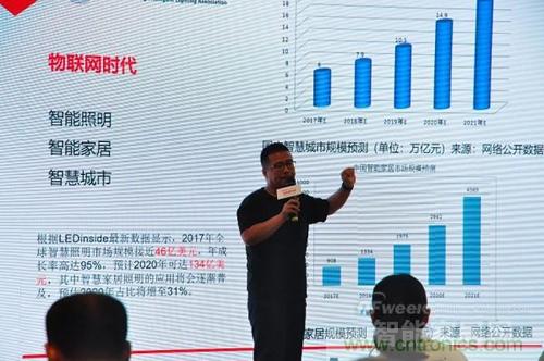 上海浦東智能照明聯(lián)合會秘書長代照亮則為現(xiàn)場觀眾帶來了物聯(lián)網(wǎng)時代智能照明領(lǐng)域的最新進展。根據(jù)最新數(shù)據(jù)顯示,2017年全球智慧照明市場規(guī)模接近46億美元,年成長率高達95%,預計2020年可達134億美元,其中智慧家居照明的應(yīng)用將會逐漸普及,預估2020年占比將增至31%。