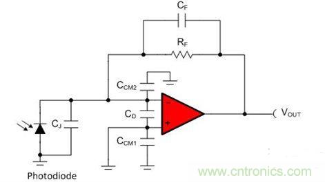 圖1:反饋電容器CF補(bǔ)償光電二極管接觸電容和運(yùn)算放大器輸入電容