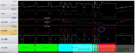 圖6波特率異常(位寬度從2us突然變成1.6us),導致位錯誤引起錯誤幀。位寬的不穩定是波特率不穩定導致的,最有可能的原因是晶振問題,建議更換晶振測試。