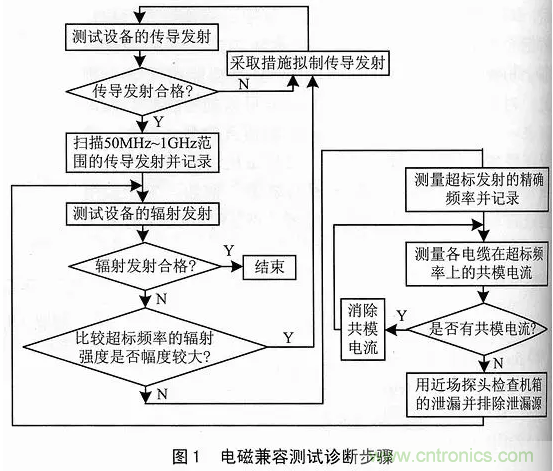 圖1給出了一個設(shè)備或系統(tǒng)的電磁干擾發(fā)射與故障分析步驟。按照這個步驟進(jìn)行,可以提高測試診斷的效率。