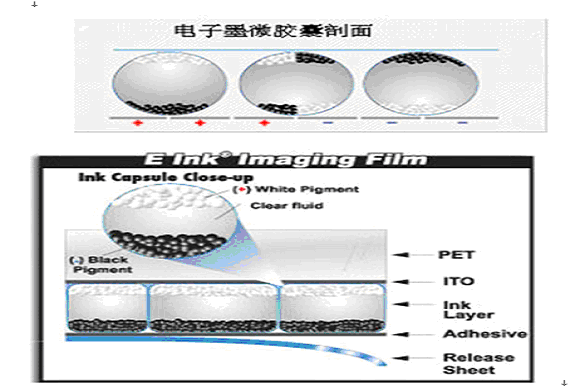 E-Ink的電子紙由電子墨水及兩片基板所組成:第一部分是電子墨水,有時(shí)被稱為“前基板(front plane)”;二是使電子墨水生成文本和圖像所需要的電子設(shè)備組合,包括控制部分和顯示部分,被稱為“背基板(backplane)”。背基板上面涂有由無數(shù)微小的透明顆粒組成的電子墨水,顆粒直徑只有人的頭發(fā)絲的一半大小。電子墨水是一種加工成薄膜狀的專用材料,與電子顯示設(shè)備結(jié)合在一起使用,是化學(xué)、物理學(xué)和電子技術(shù)的綜合應(yīng)用。電子墨水由數(shù)百萬個(gè)尺寸極小的微膠囊構(gòu)成,直徑與頭發(fā)絲相當(dāng)。每一個(gè)微膠囊中含有帶正電荷的白色粒子和帶負(fù)電荷的黑色粒子,它們懸浮在清潔的液體中。 如圖1所示,電子墨水薄膜的頂部是一層透明材料,作為電極端使用;底部是電子墨水的另一個(gè)電極,微膠囊夾在這兩個(gè)電極間。微膠囊受負(fù)電場作用時(shí),白色顆粒帶正電荷而移動(dòng)到微膠囊頂部,相應(yīng)位置顯示為白色;黑色顆粒由于帶負(fù)電荷而在電場力作用下到達(dá)微膠囊底部,使用者不能看到黑色。如果電場的作用方向相反,則顯示效果也相反,即黑色顯示,白色隱藏。可見,只要改變電場作用方向就能在顯示黑色和白色間切換,白色部位對應(yīng)于紙張的未著墨部分,而黑色則對應(yīng)著紙張上的印刷圖文部分。