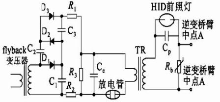 啟動期間,電子鎮流器要經歷高壓擊穿、電流接續、預熱維弧3個階段。高壓啟動電路是HID 前照燈能否瞬間點亮的基礎。但輝光放電后慣性和濾波延遲使直流變換器和檢測回路很難有較快的響應速度,所以需要如圖1所示的電流接續(take-over) 電路,它可利用電容預先儲存的能量為燈提供一個較大的瞬間電流(約300ms) ,保證輝弧可靠過渡。一般高壓發生電路有以下幾種: