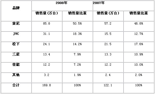 表2 2007-2008年中國數碼攝像機市場品牌銷售量結構