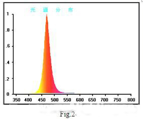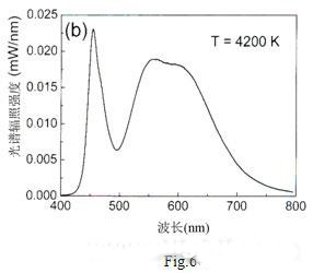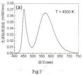 以InGaN藍(lán)光LED和1號(hào)熒光粉制成的白光LED的發(fā)射光譜示如Fig.6,其光效為55lm/W,色溫4500K。這是本人所知道白光LED的最高光效報(bào)導(dǎo)(據(jù)測(cè)試國(guó)內(nèi)1W白光LED的光通量大多在40lm以下)。采用2號(hào)和3號(hào)混合熒光粉試制的白光LED的發(fā)射光譜示如Fig.7,其顯色指數(shù)提高到82,色溫4200K,但光效確降低到20lm/W。