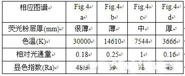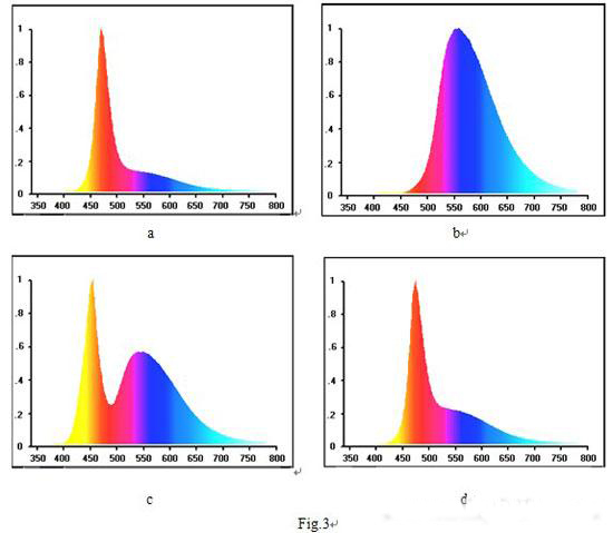 我們?cè)鴮?duì)此進(jìn)行了實(shí)驗(yàn)研究,我們利用某公司生產(chǎn)的1W高亮度藍(lán)光LED,其光譜的中心輻射波長(zhǎng)為470nm見(jiàn)Fig.3,去除外封裝后分別涂敷不同厚度的輻射的中心波長(zhǎng)為560nm的黃光熒光粉涂層,經(jīng)處理后測(cè)量其發(fā)射光譜。從二十余種不同厚度的樣品中選擇了四種典型情況,其結(jié)果見(jiàn)Fig