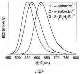 [page]2007年日本材料科學(xué)研究所納米陶瓷中心得到的結(jié)果是最高的[3],他們采用中心波長(zhǎng)為450nm的InGaN藍(lán)光LED和光子轉(zhuǎn)換效率高、在450nm藍(lán)光范圍 有強(qiáng)吸收峰、溫度系數(shù)低的三種熒光粉進(jìn)行了試驗(yàn),這三種熒光粉分別為:α-sialon: Yb2+、α-sialon: Eu2+和Sr2Si5 N8: Eu2+。這些熒光粉的特點(diǎn)是發(fā)光效率的熱衰減較小,在