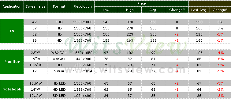 9月份筆記本電腦面板需求受惠于Windows 7新機鋪貨,下游客戶訂單量仍維持一定的水準,面板價格有漲有跌,上下幅度約1~2美元,一線品牌客戶價格壓力較大,在10月的面板需求將較9月份減少的影響下,估計面板價格跌幅將擴大至2-3美元;9月份液晶電視面板價格則大致維持穩定,小尺寸26W及32W面板在少數客戶端的價格微幅下調2~3美元,40W以上則大都持平,大陸十一國慶長假的銷售成為市場關注的焦點,銷售結果將左右10月份電視面板價格的走勢,另一方面,由于監視器面板產能已經松動,因此估計小尺寸電視價格走勢將受牽連,下跌幅度約5-10美元。