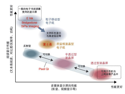 具體來說,日本Bridgestone公司與美國SiPix Imaging公司等多家廠商已經開始為電子書閱讀器提供電子紙。美國初創企業Pixel Qi公司也開始提供具有專門設計的電子紙顯示模式的液晶顯示屏。