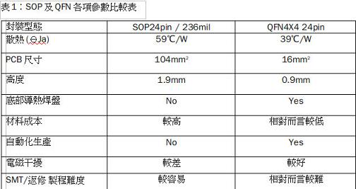 一般在使用的SOP其尺寸為104mm2(8X13x1.9mm),而QFN相對(duì)的尺寸只有16mm2(4X4X0.9mm)只有SOP的6~7分之一的尺寸;在做一些小間距的顯示屏設(shè)計(jì)上具有更大的彈性。