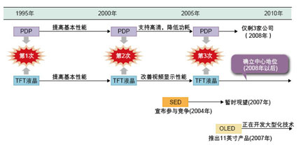 在液晶顯示器市場剛開始啟動的1998年,當時的夏普公司社長(現任董事長)町田勝彥的發(fā)言震驚了整個行業(yè)。他表示: “到2005年,夏普在日本國內銷售的電視將全部采用液晶屏。” 當時,液晶電視并未普及,在夏普公司內部對于彩色液晶屏也并沒有十足的把握。但是,這一句話成為液晶電視掃蕩市場的導火索,那以后,液晶電視以超乎町田勝彥預想的驚人速度推廣開來。在此過程中,液晶與PDP(等離子)、SED(表面?zhèn)鲗щ娮影l(fā)射顯示)等技術展開了激烈的競爭(見圖3)。