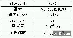 圖10表4分別是利率BSD技術制作之2.6吋彩色FED外觀圖與規格;由于BSD的電子發射源可在大cellgap環境下,以垂直方式在涂有螢光體的面板上產生圖樣(pattern),因此祇要驅動電路與驅動方式經由最加化設計,便可獲得令人滿意的影像顯示效果。